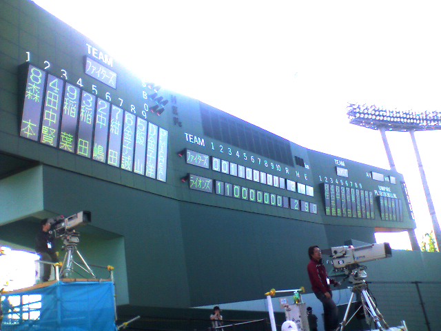 試合は、3-2でファイターズが勝利。小田と金子誠が3打数3安打。西武は満塁のチャンスを潰し、2度の23塁のチャンスを掴むも1度だけパスボールで点を取っただけ。しかも、ライオンズが得点した直後にファイターズが得点するというパターンでした。しかし、3-2で4時間試合って一体w